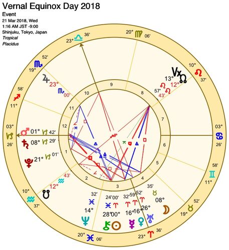 2018年の春分図。今年に何が始まるのか。ASC山羊座4度のサビアンシンボルは「大きなカヌーへ乗り込む一団」、強い結束による共同作業。このASCにのる火星は2度「三つのステンドグラスの窓、一つは爆撃で損傷している」。自分の精神性が他者に通じないことを…