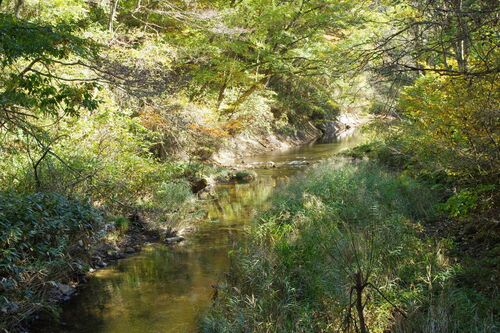 花巻駅から「花巻温泉」方面のバスに乗って、「釜淵の滝入口」で降りる。その1つ前が「花巻温泉」で、にぎやかな温泉街が見えた。そのあとが「釜淵の滝入口」でそこで降りるが、周りに特に何にもない急な坂道の途中。iPhoneの地図では、ここから釜淵の滝へは…