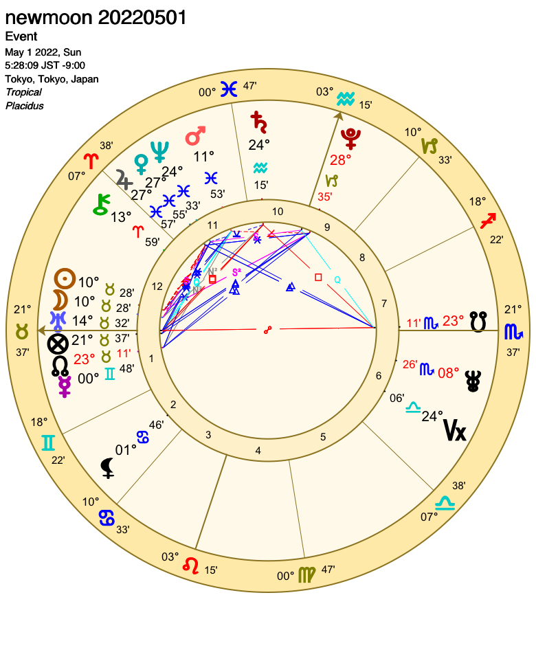 蝕を伴なう新月は、約半年に1度の特別な新月。リセット・デトックスなど、浄化の力も強い。個人的に東京でのASC・MCと度数が同じこともあり、ちゃんと読んでおこうと思った。5月1日からかなり過ぎてしまっているけど、まあ半年ほど影響が続くので。ちなみに次の日食は2022年10月25日だそう。