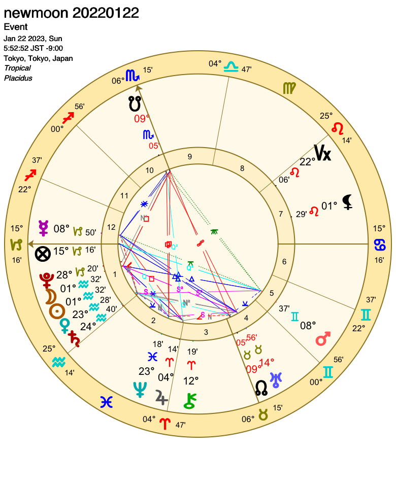 ASCと支配星の土星は、どちらも、教育に関連する度数でもある。この新月は教えること・教わることから始まることも。これらは、どちらかというとフィジカル・ロジカルの中において伝授されることなので、感情に振り回されない方が、伝達は上手くいく。フィジカル・ロジカル的にベストな方法を捉えて、それに集中する。