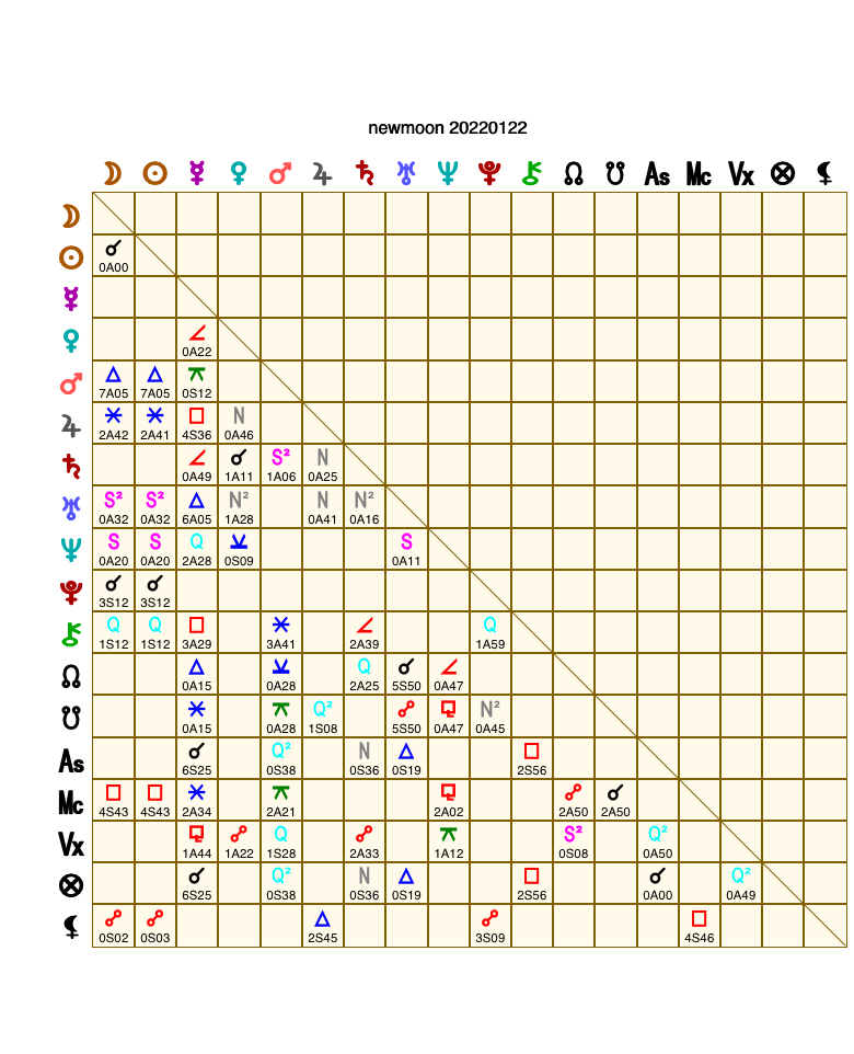 ASCのスタートの判断が、自分にふさわしい選択だったとしても、ここで早速に第一関門がやってくる、といったイメージ。この新月の度数は不穏だけれど、アスペクトを見ると、天体どうしの連携はパワフルでもあるので、できる限り手を打ってみるといいように思う。新月は5室の双子座の火星と120度で、新月のテーマを高い集中力でそのまま行動に移せて、それは自己表現・創造的なこととして発揮される。3室の牡羊座の木星と60度で、会話・対話・言語化によって、工夫・具体化でき、そのことで発展・恩恵がある。アイデアや新しいことを話すこと、新しい基礎を習得することは吉。天王星とのバイセプタイル、海王星とのセプタイルもあり、何が何でも夢の実現に向けて突き進む雰囲気が。これまでの常識に囚われず、小さな可能性にも光を当てることが大切。